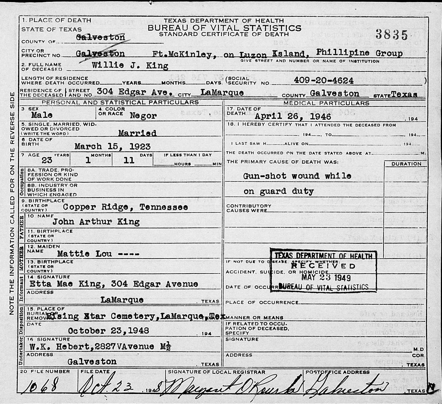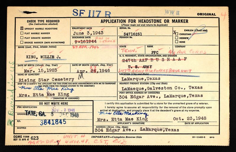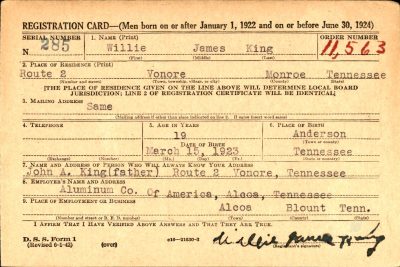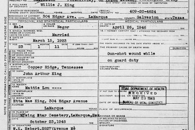 Willie James King was born in Copper Ridge, Tennessee, the son of John Arthur and Mattie Lou King. He was shot while on guard duty and died of his wouds on 26 April 1946 at Fort McKinley on Luzon Island, Philippines. He is buried at Rising Star Cemetery, LaMarque, TX