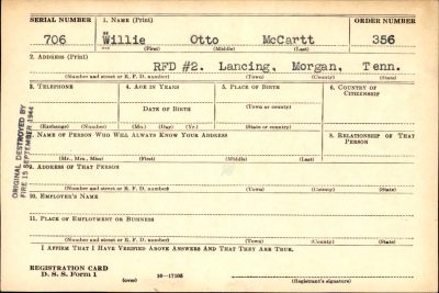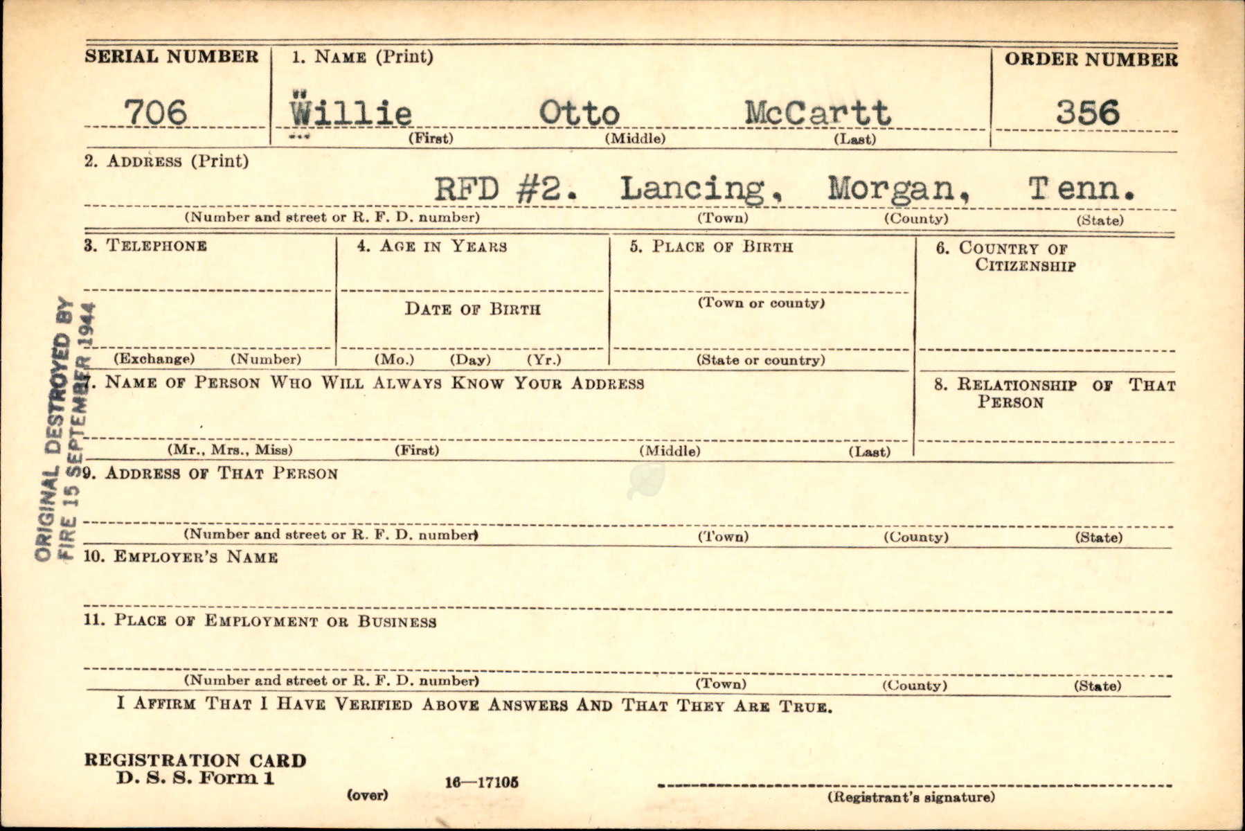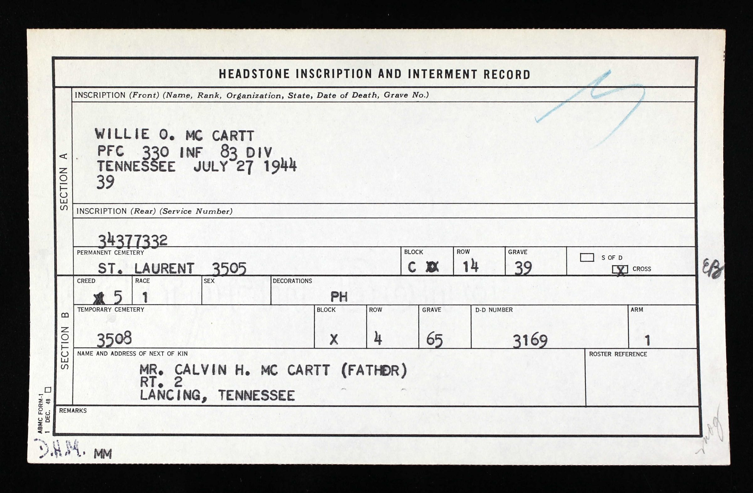 William “Willie” Otto McCartt was born in Tennessee in 1916 and was the son of Calvin Harrison McCartt Delilia Dyer. He was survived by his parents and three sisters.