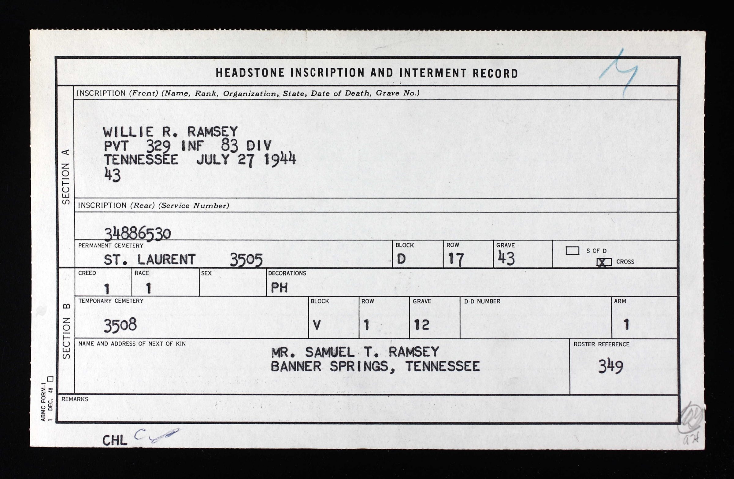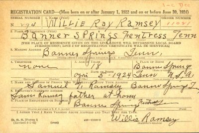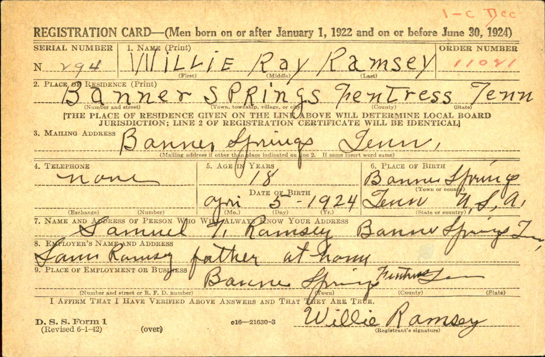 Willie Ray Ramsey was born at Banner Springs, Tennessee, the son of Samuel T. Ramsey and Ora Louise Rodgers.