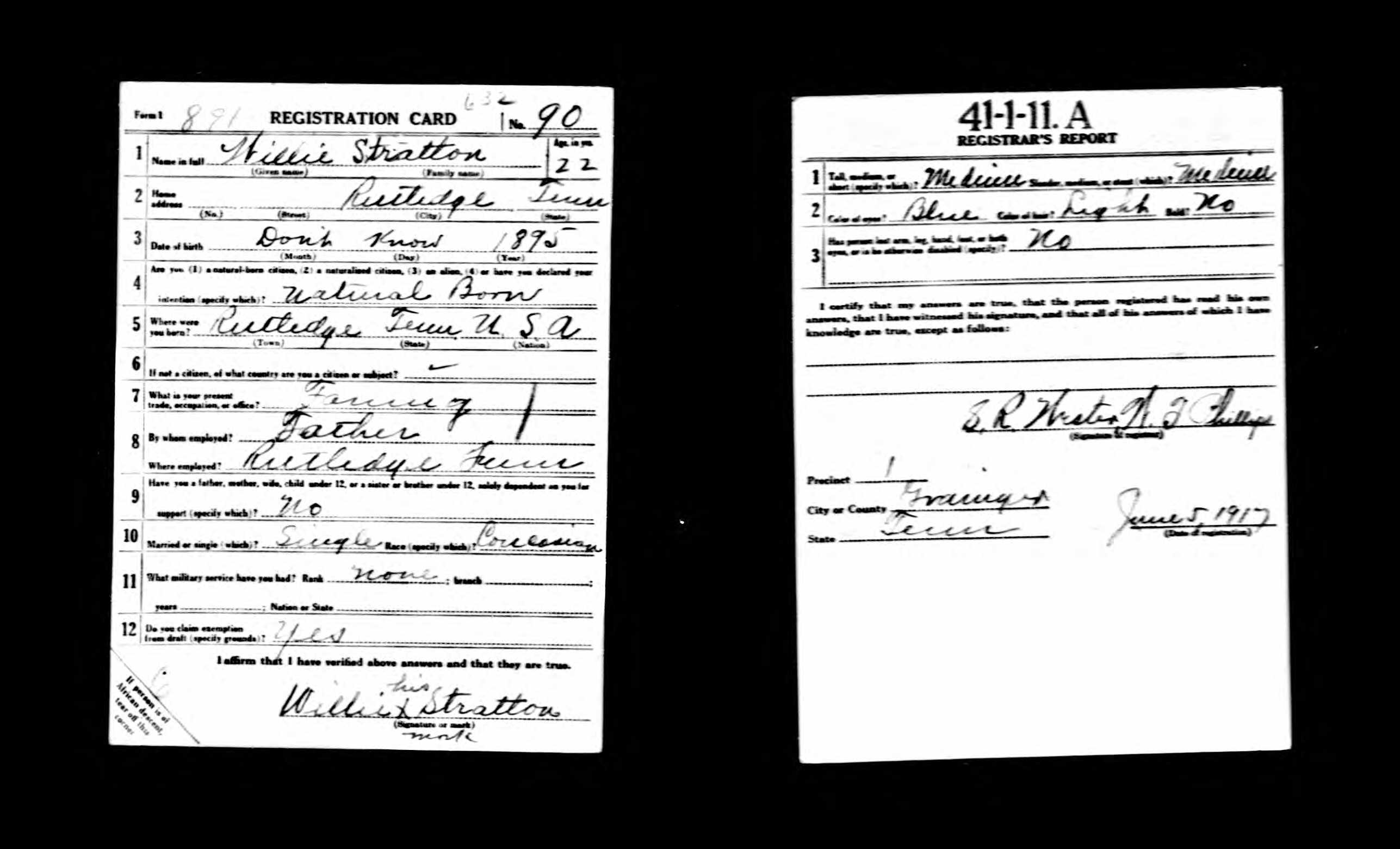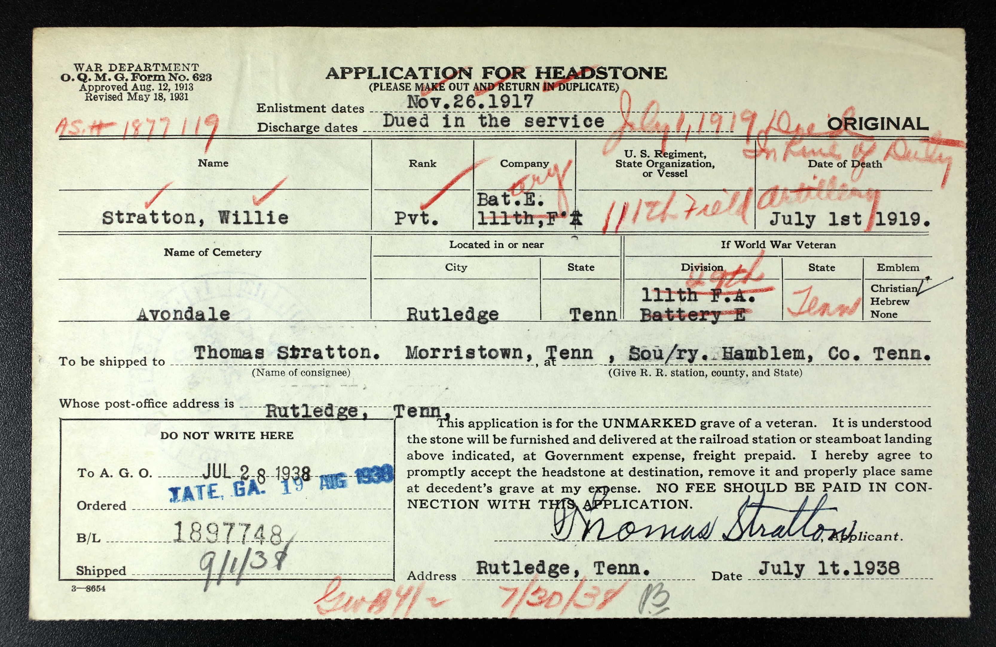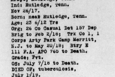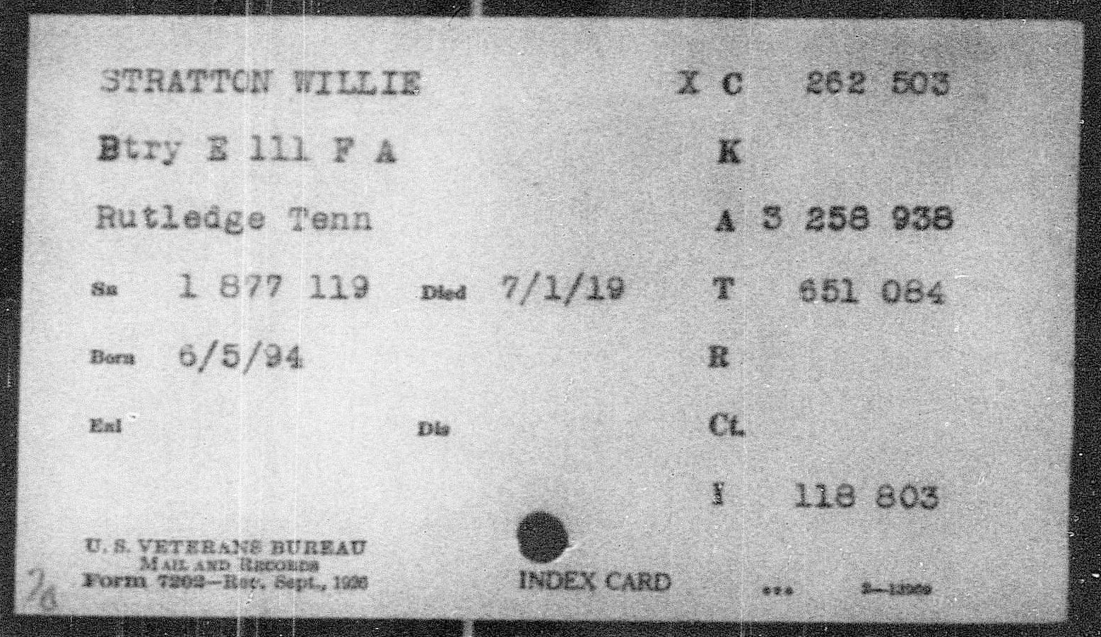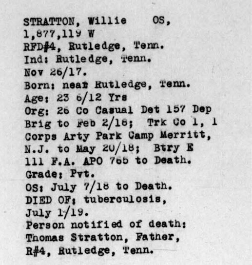 Willie Stratton was born in 1894 at Rutledge, TN, son of Thomas Stratton. He died of tuberculosis on 1 July 1919 at Camp Wadsworth in Spartanburg, S.C. after having served in France. Buried at Avondale Cemetery, Rutledge, TN.