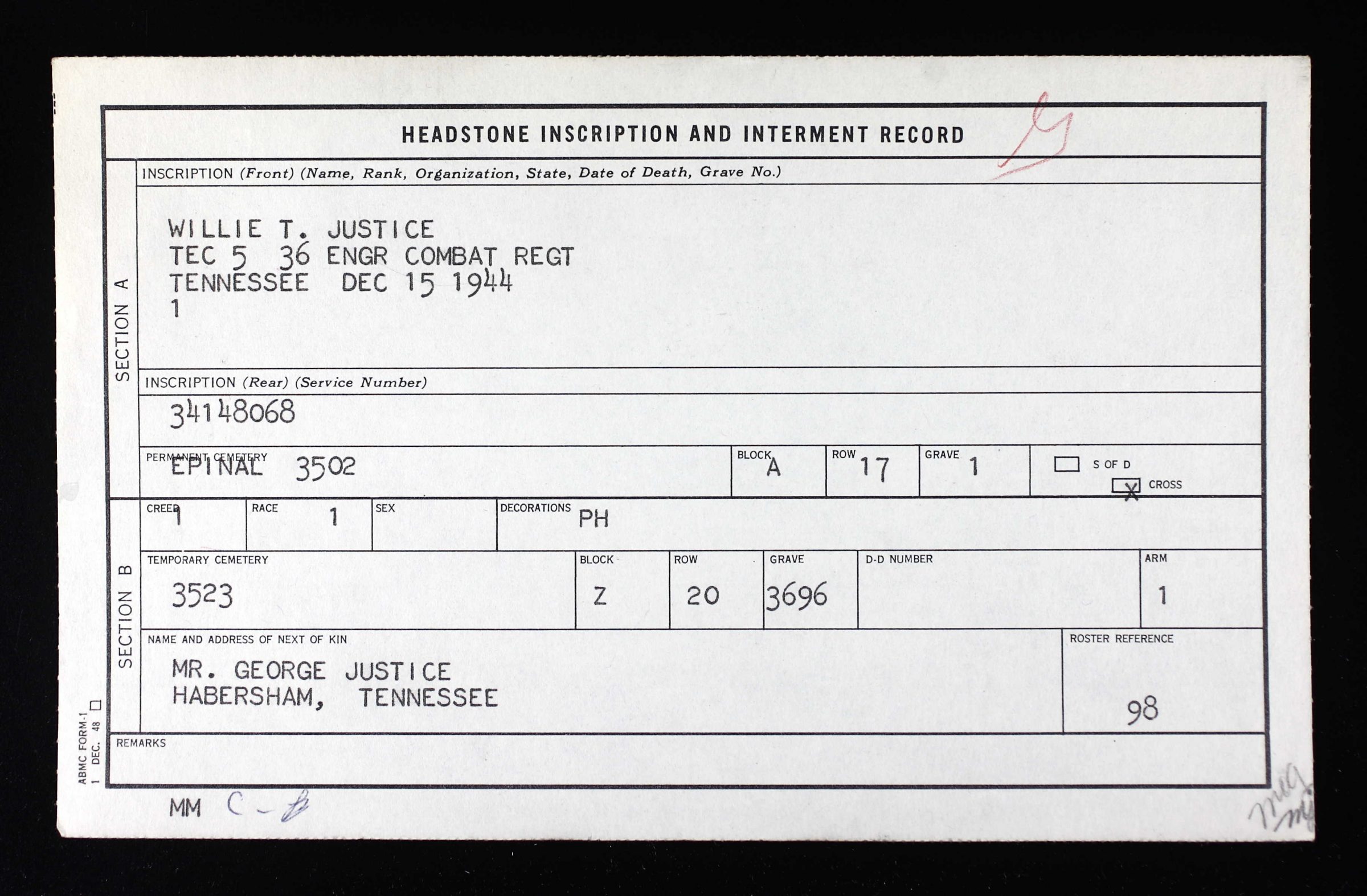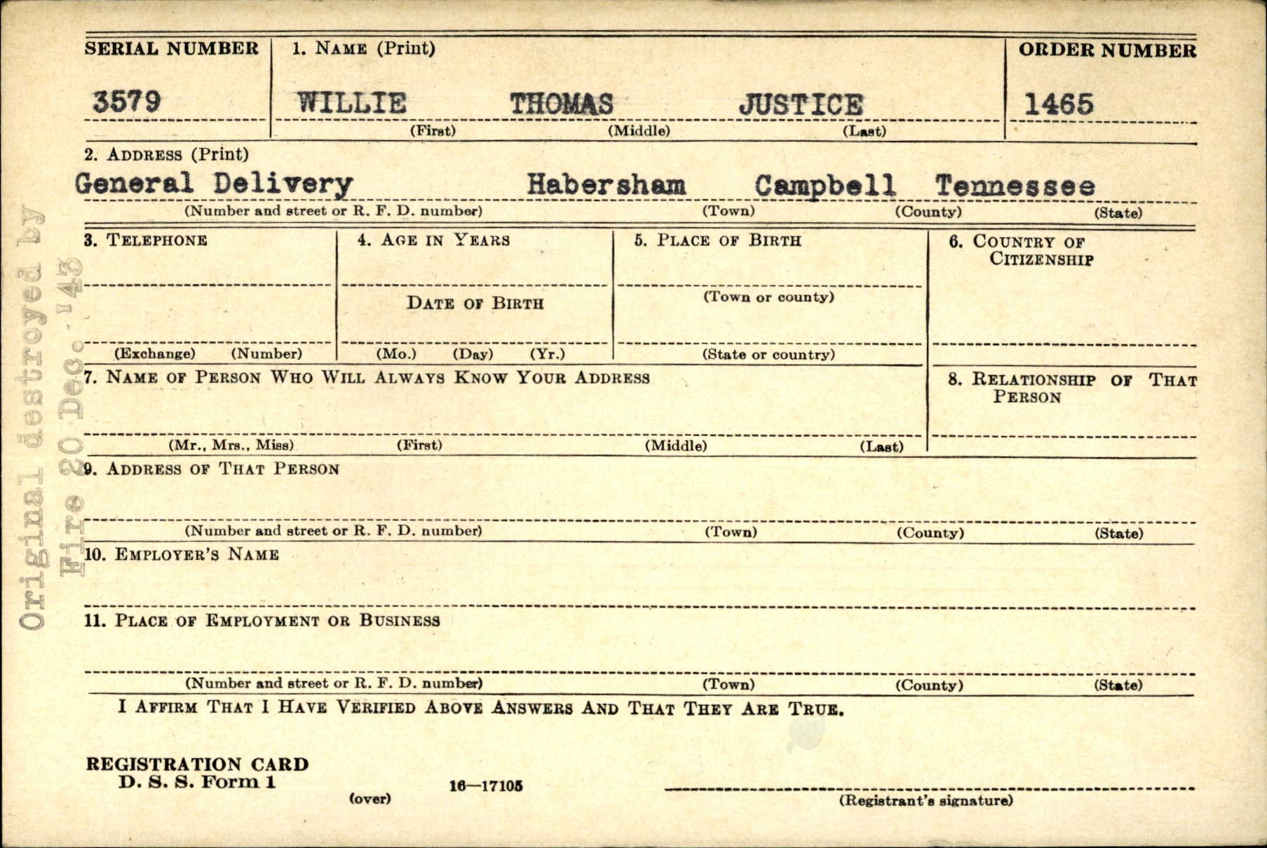 Willie Thomas Justice was born in 1919 in Tennessee, the son of George Justice and Gertie Taylor.