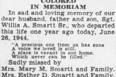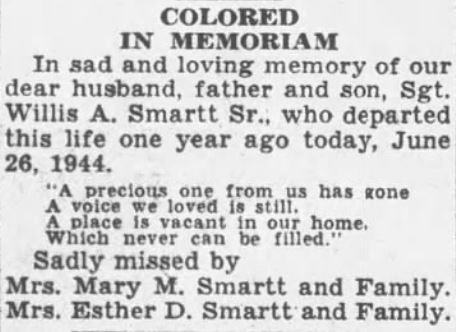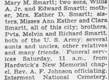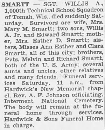 Sgt. Willis A. Smartt, 1,000th Technical School Squadron of Tomah, Wis., died suddenly Saturday. Survivors are wife, Mrs. Mary M. Smartt; two sons, Willis A. Jr. and Edward Smartt; mother, Mrs. Esther D. Smartt; sisters, Misses Ann Esther and Clara Smartt, all of this city; brothers, Pvts. Melvin and Richard Smartt, both of the U.S. Army; several aunts and uncles, other relatives and many friends.