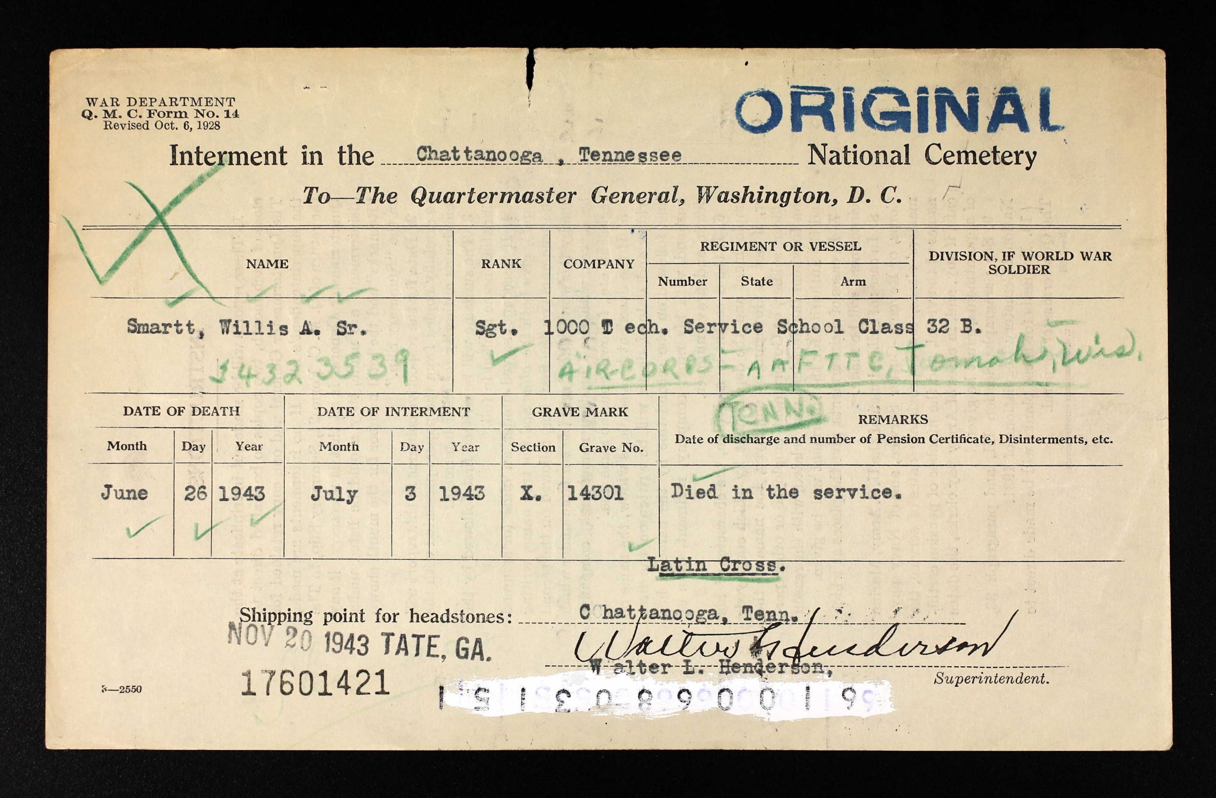 Buried at the Chattanooga National Cemetery, X, 14301