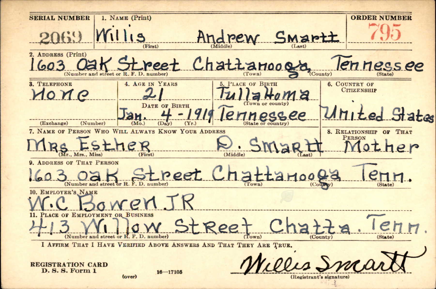 Willis Andrew Smartt was born Tullahoma, Tennessee to Lemuel Smartt and Esther Durley.