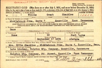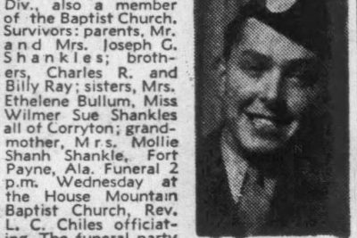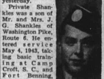 Pfc. Willis G. Shankles, 20, Route 6, was killed in action Feb. 18 on Corregidor, the War Department announced yesterday. Private Shankles was a son of Mr. and Mrs. J.G. Shankles of Washington Pike, Route 6. He enetered service May 4, 1943, taking basic training at Camp Scroft, S.C. and Fort Benning Ga. He had been overseas more than 16 months. A former employe of a Knoxville manufacturing concern, Private Shankles is survived, in addition to his parents, by two sisters, Etheleen and Wilma Sue and two brothers, Charles and Billy Ray SHankles.