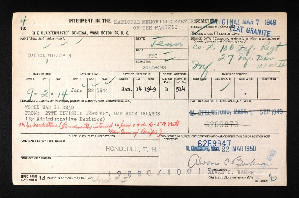 - Burial/Memorial Location: Honolulu Memorial, Honolulu, Hawaii