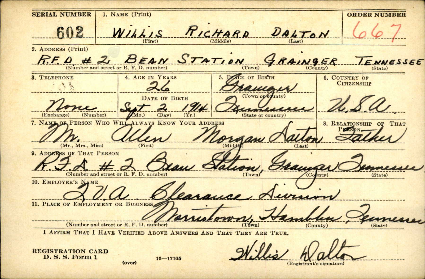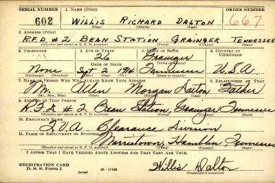 Willis Richard Dalton was born on 2 September 1914, the son of Allen Morgan Dalton and Julia Ann Samsel.