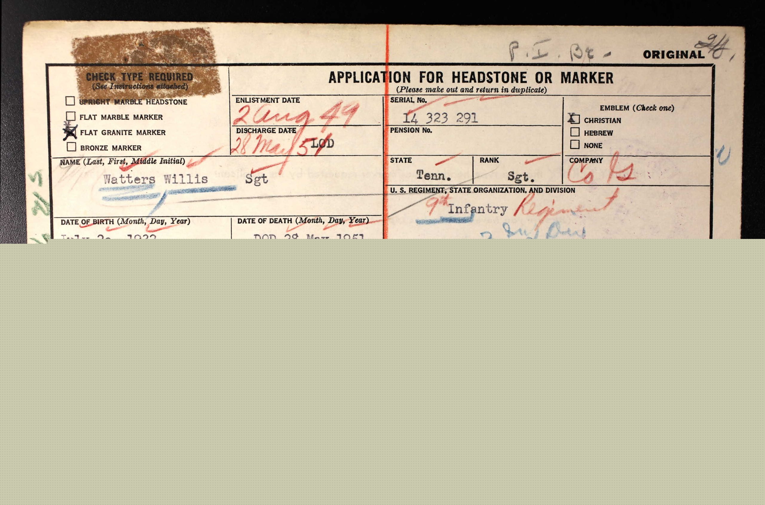 Sgt. Willis watters, 19, of Oneida, killed in action in Korea, May 28, 1951. Services held at Baptist Church at Foster Cross Roads Wednesday Nov. 7. Sergeant Watters’ body was returned to Oneida Tuesday, Nov. 6, 1951. He was a member of Co. G, 9th Infantry Regiment, 2nd Division. Surviving are his mother, Mrs. Ella Watters; four brothers, Chester of Eugene, Ore., Holland of Pontiac, Mich., Warren and Olan of Oneida; four sisters, Mrs. Gladys Wilson of Pontiac, Mich., Mrs. Jewell Boyatt of Oneida, Mrs. Lucille King of Strunk, Ky., Mrs. Myrtle Manley of Chicago, Ill. Sergeant Watters attended Oneida High School, enlisting Aug. 2, 1949, spent five months in Japan and then was sent to Korea.