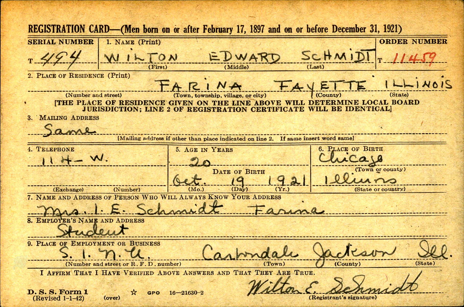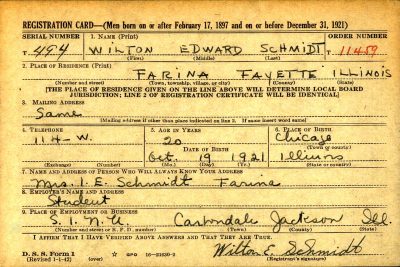 Wilton Edward Schmidt was born in Chicago, Illinois, the son of Irvin Edward Schmidt and Ruth Harriet Bingham. He attended Southern Illinois Normal University in Illinois.