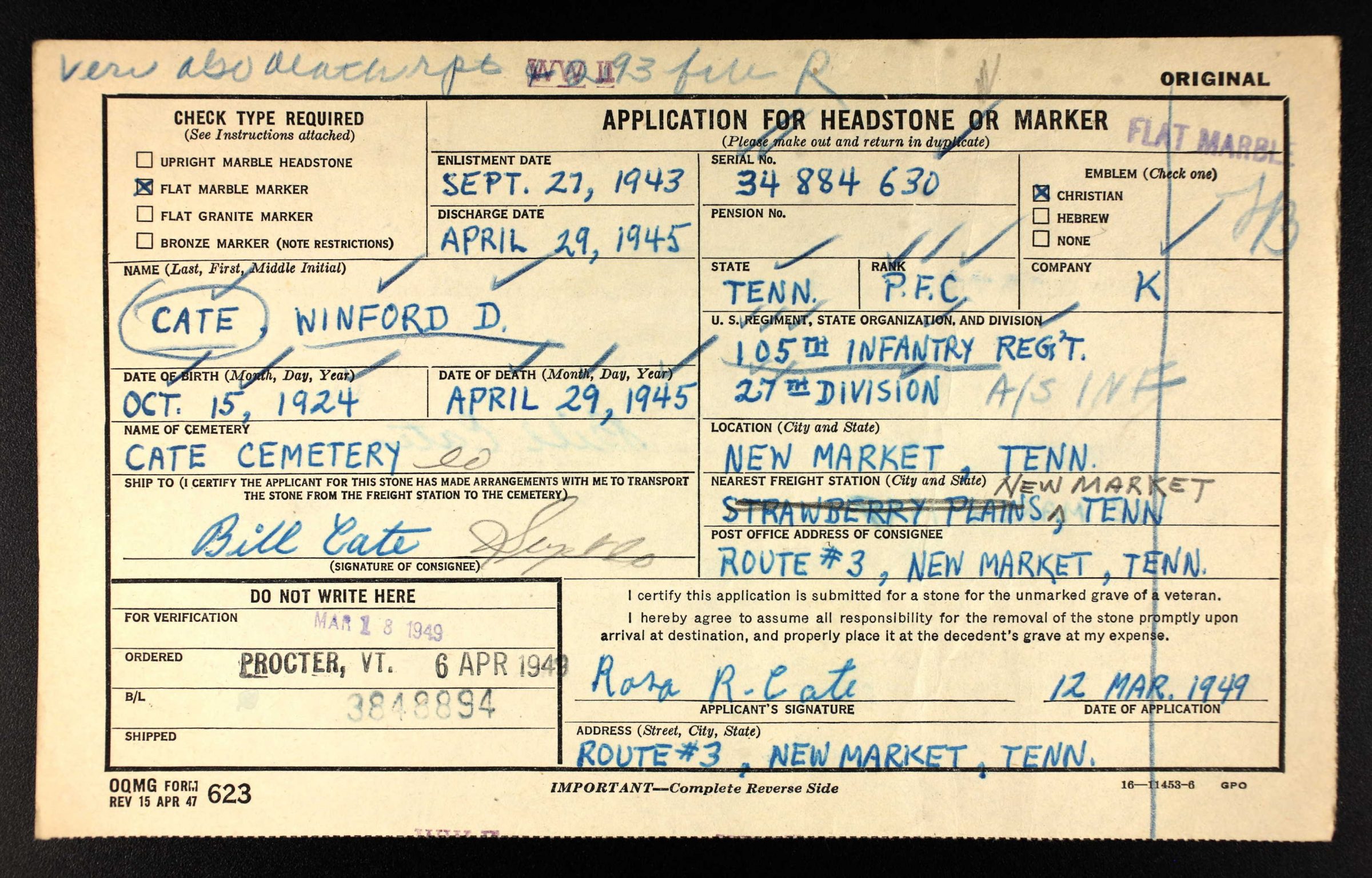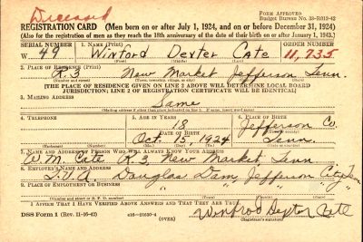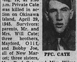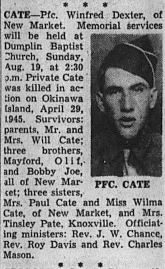 Pfc. Winfred Dexter Cate, of New Market. Memorial services will be held at Dumplin Baptist Church, Sunday Aug. 19, at 2:30 p.m. Private Cate was killed in action on Okinawa Island, April 29, 1945. Survivors: parents, Mr. and Mrs. will Cate; three brothers, Mayford, Olif, and Bobby Joe, all of New Market; three sisters, Mrs. Paul Cate and Miss Wilma Cate of New Market, and Mrs Tinsley Pate, Knoxville.