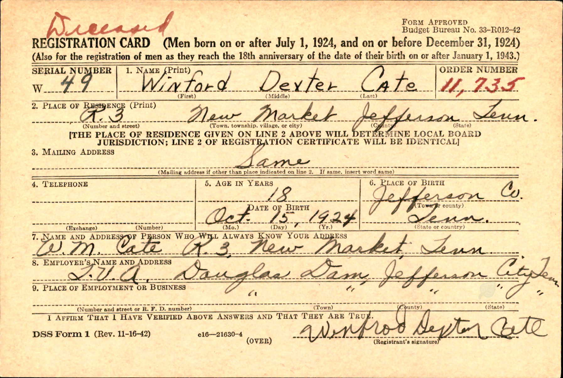 Winfred Dexter Cate was born 15 October 1924 to William ‘Bill’ Murphy Cate and Rosa V. Robertson