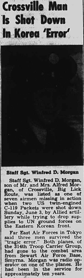 Staff Sgt. Winfred D. Morgan, son of Mr. and Mrs. Alfred Morgan, of Crossville, Big Lick Route, was listed as one of seven airmen missing in action when two US twin-engined C-119 Packets were shot down Sunday, June 3, by Allied Artilelry while trying to drop supplies to UN ground forces on the Eastern Korean front. Far East Air Forces in Tokyo said three men survived the tragic error. Both planes, of the 314th Troop Carrier Group, had gone to the combat area from Sewart Air Force Base, Smyrna. Morgan was radio operator on one of the planes. He had been in the service for approximately ten years.