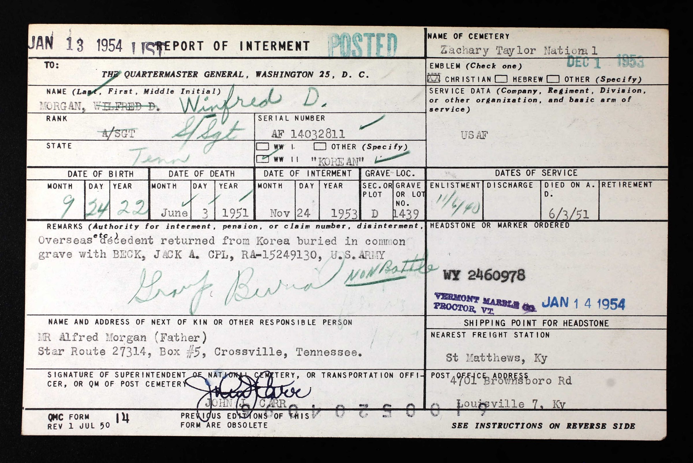 - Burial/Memorial Location: Zachary Taylor National Cemetery, Louisville, Jefferson County, Kentucky