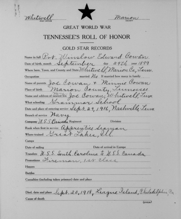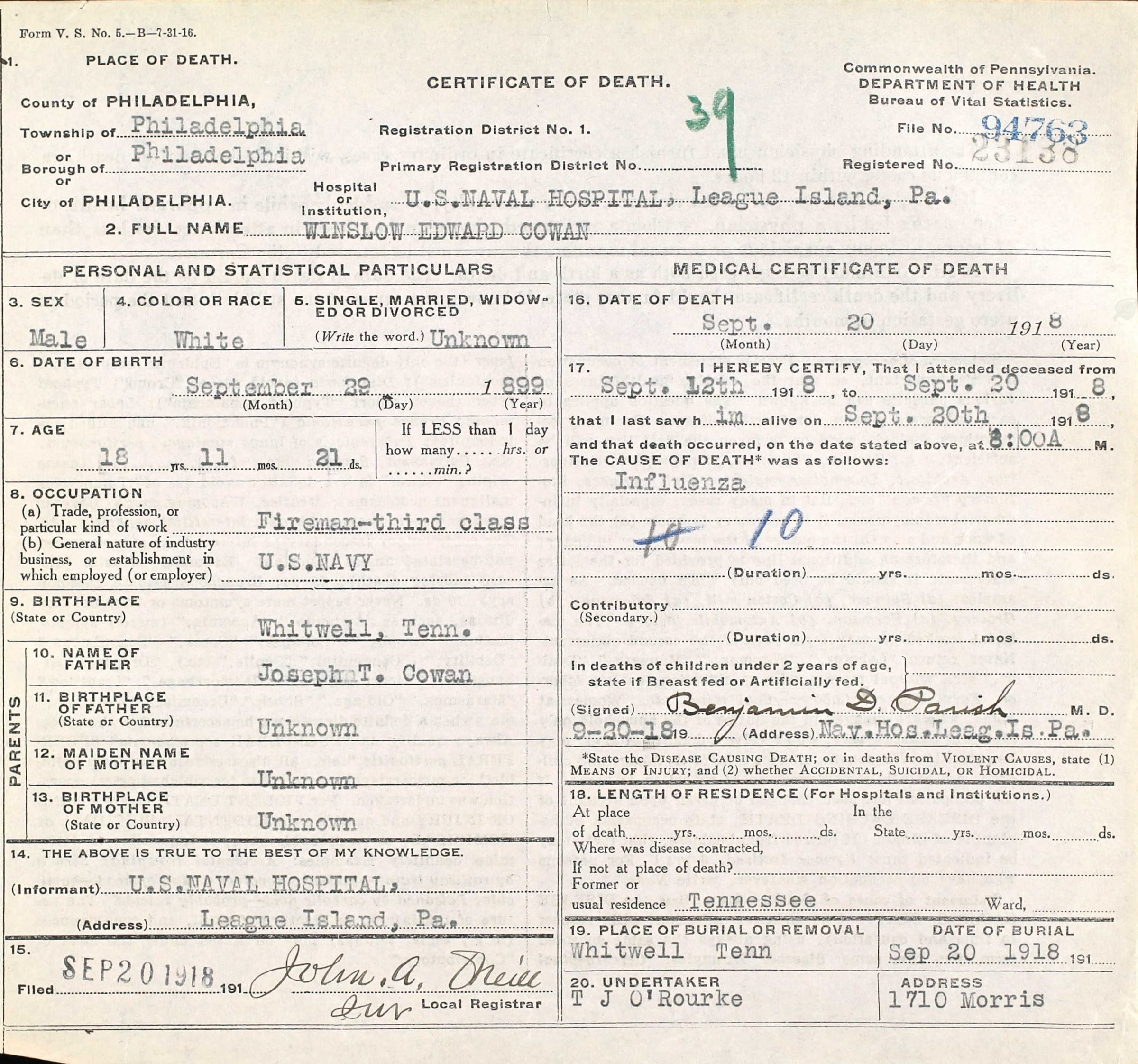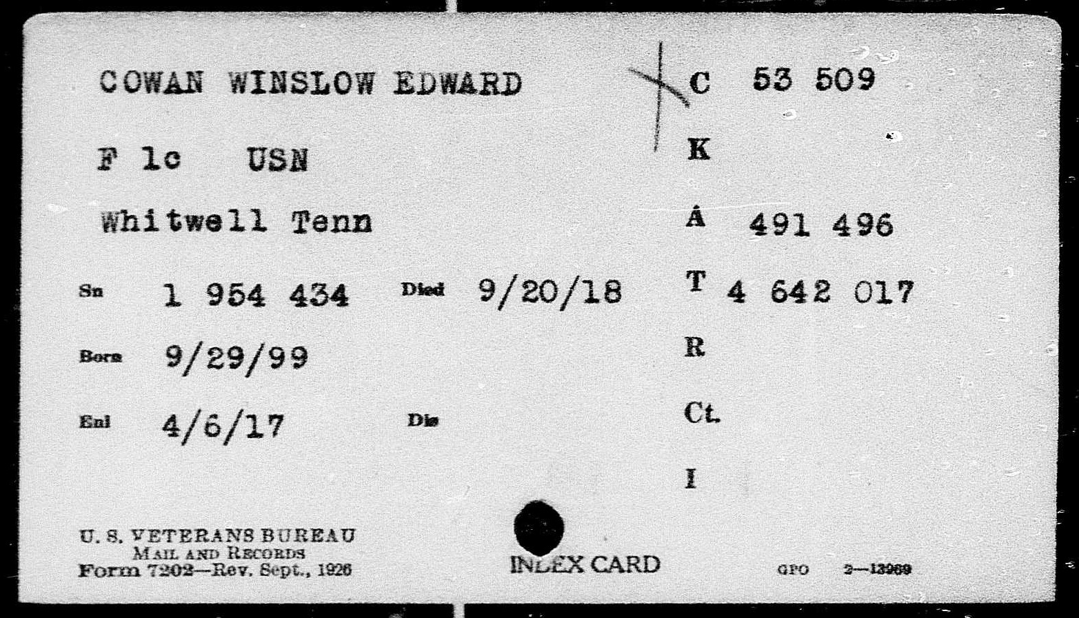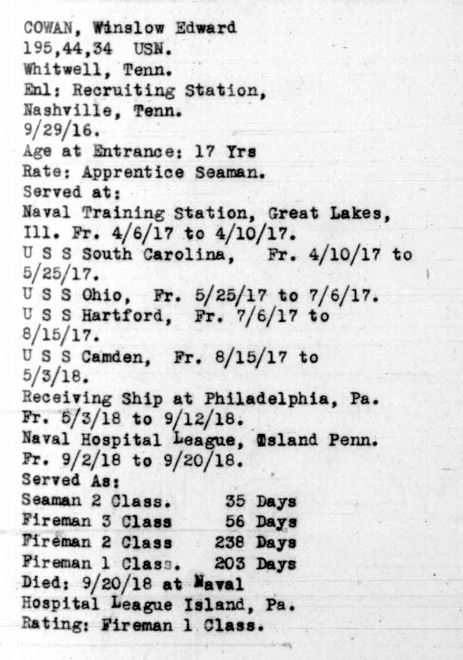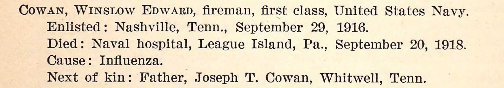 Winslow Edward Cowan was born in Philadelphia County, Pennsylvania, son of Joseph T. Cowan and Minnie Smith. Fireman 1c Cowan enlisted in Nashville, Tennessee, 29 September 1916. He died at the Naval Hospital, League Island, Pennsylvania of Influenza on 20 September 1918.