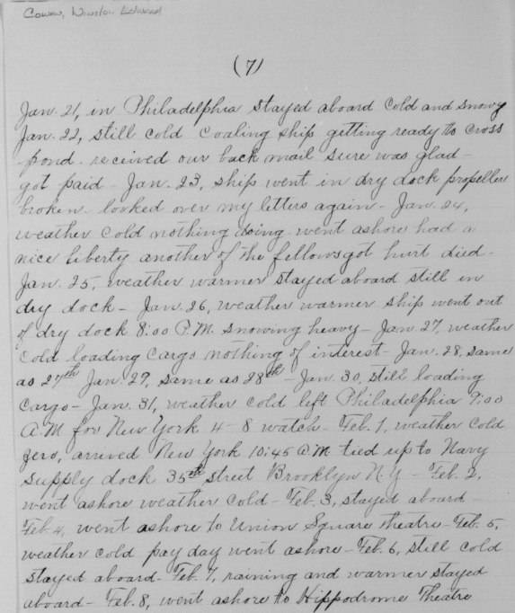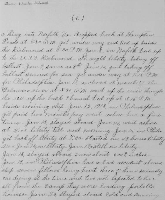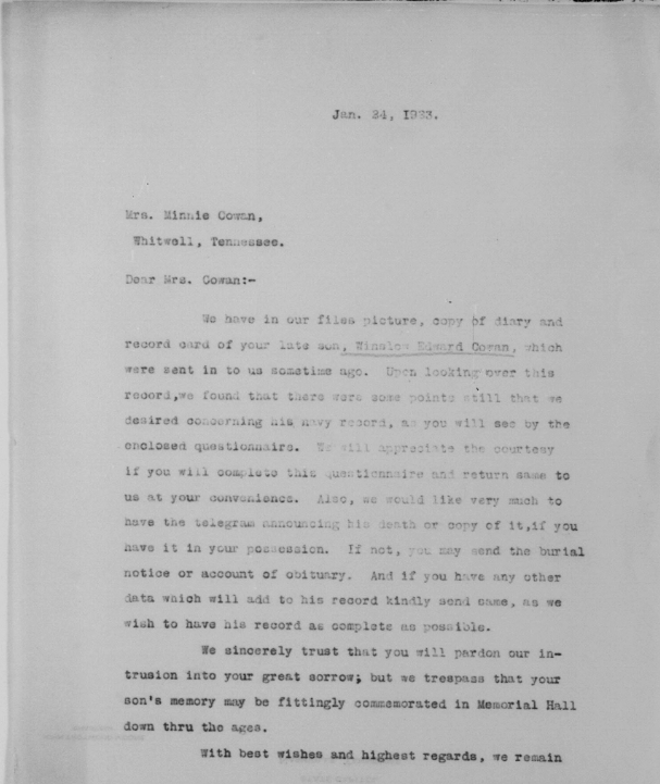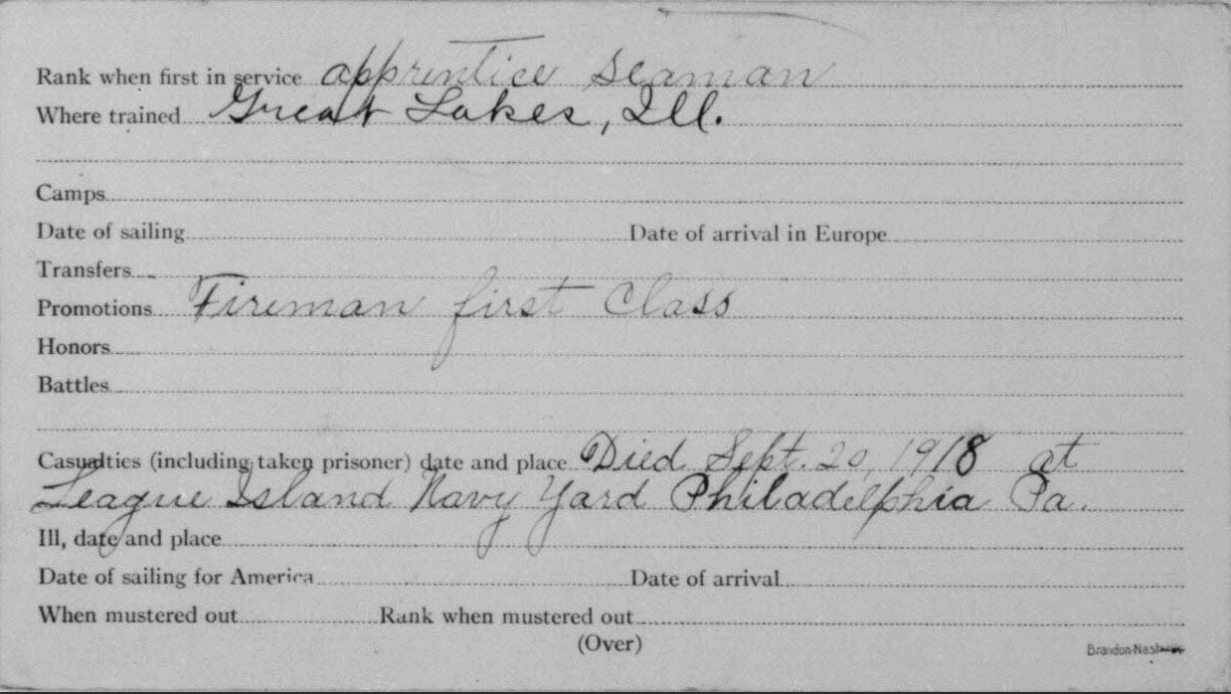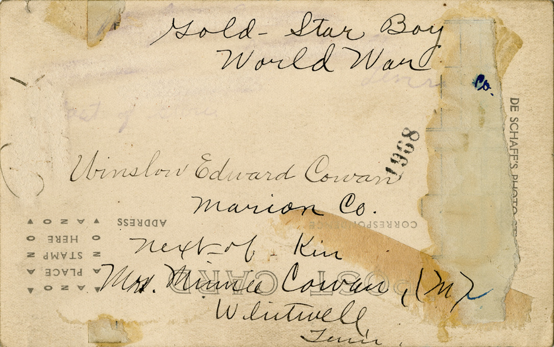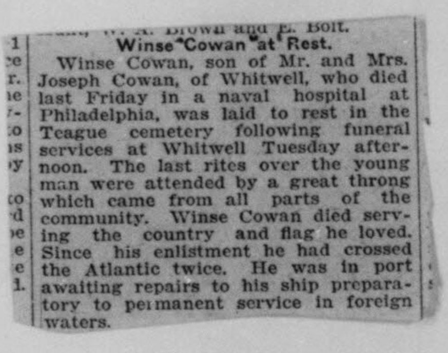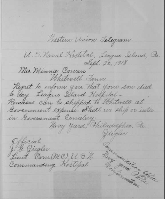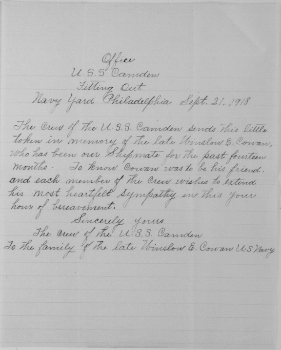 Winslow Edward Cowan was born in Philadelphia County, Pennsylvania, son of Joseph T. Cowan and Minnie Smith. Fireman 1c Cowan enlisted in Nashville, Tennessee, 29 September 1916. He died at the Naval Hospital, League Island, Pennsylvania of Influenza on 20 September 1918.