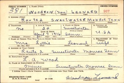 Woodrow Leonard was born on 7 April 1916 in Sweetwater , Tennessee. He was the son of William Ezekial “W Z” Leonard and Minnie Clara Boyd. Husband of Charlotte “Lottie” Joanna Johnson and father of Bernice Leonard.