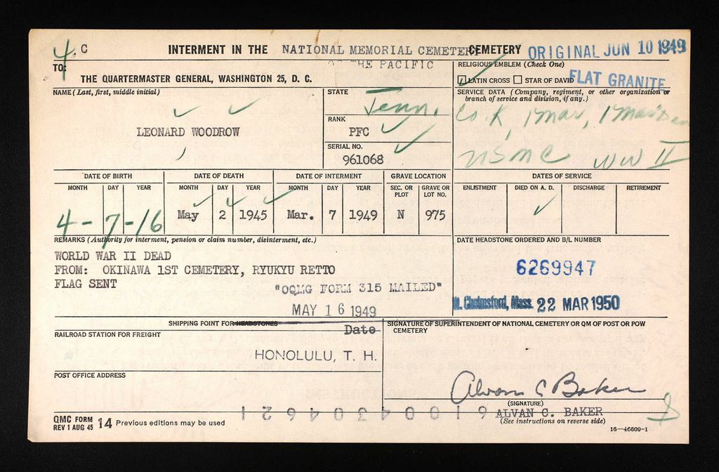 PFC Leonard was initially buried at the Okinawa 1st Cemetery, Ryukyu Retto.
