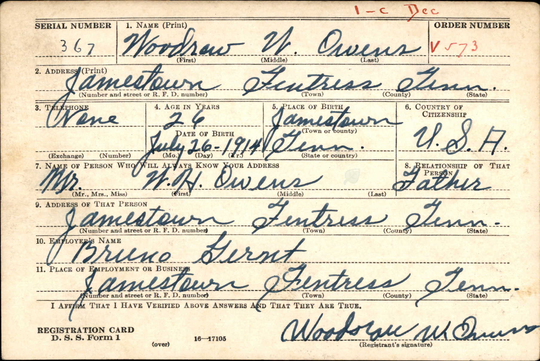 Woodrow Owens was born on 26 July 1914 in Jamestown, Fentress County, Tennessee. He was the son of William Harrison Owens and Orlena Florence Howard.