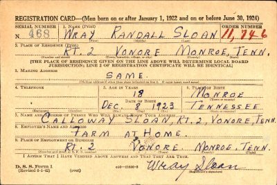 Wray Randall Sloan was born on 8 December 1923, Madisonville, Tennessee, the son of Calloway Sloan and Dixie Rosaline Lee .