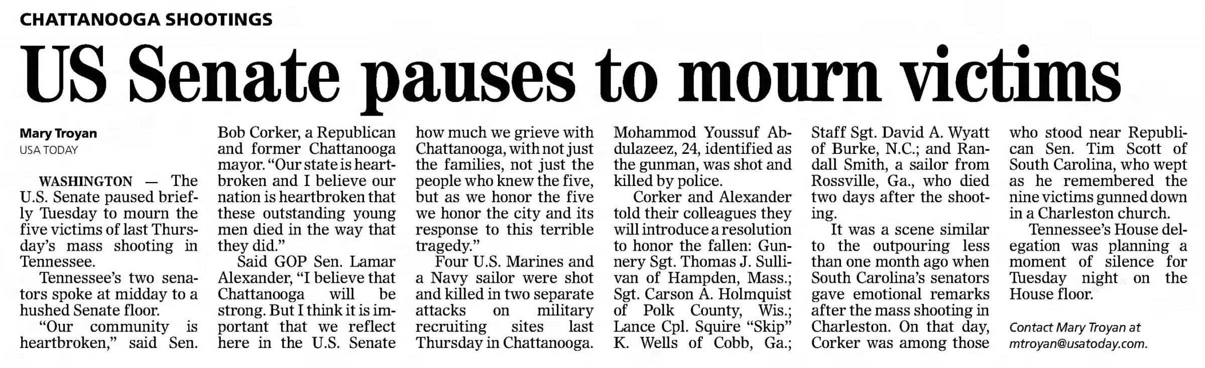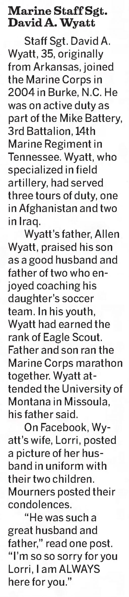 Staff Sgt. David Allen Wyatt, age 35, of Hixson, selflessly gave his life Thursday, July 16, 2015 in Chattanooga, Tennessee while protecting his Chattanooga community, his country and his fellow Marines. David will always be remembered for the heroic way in which he lived, served, and died.