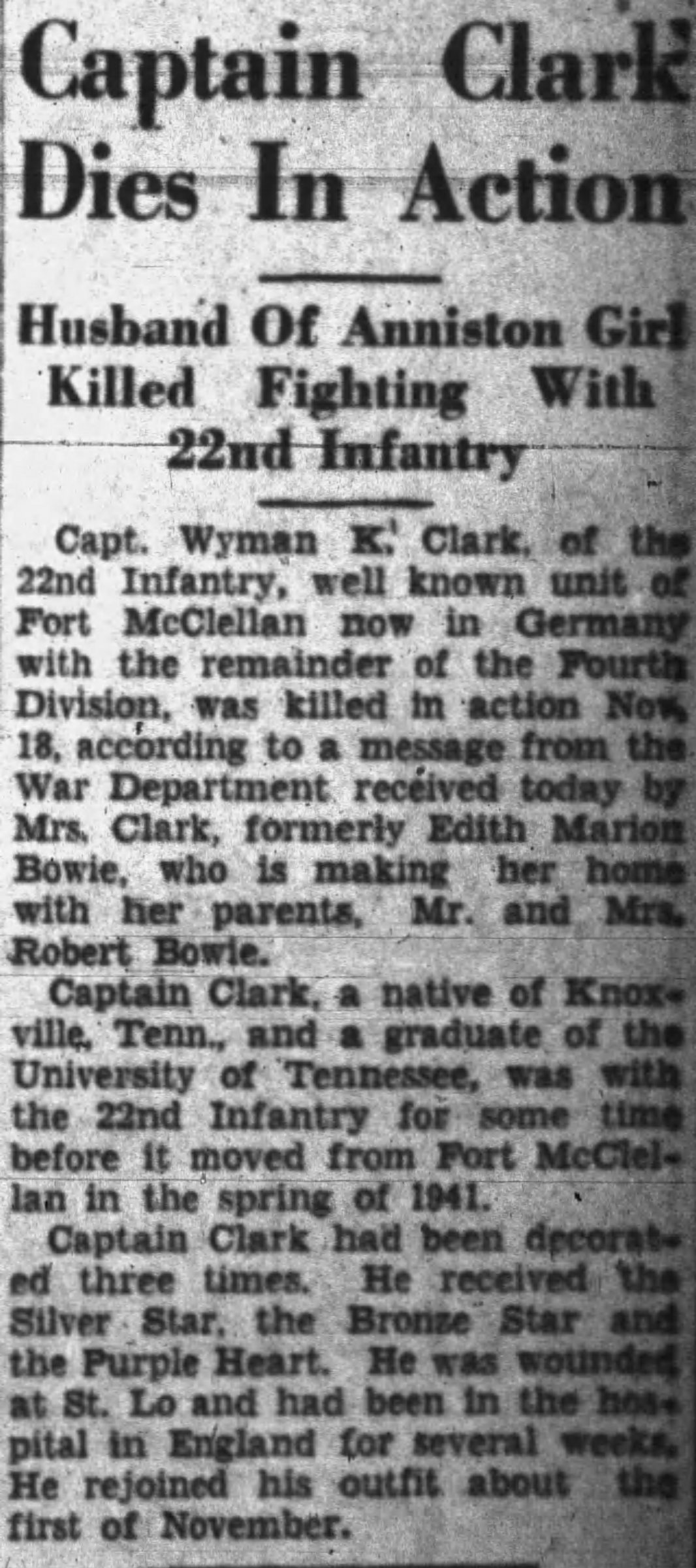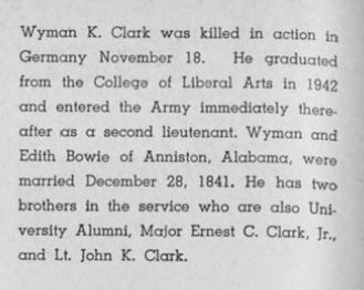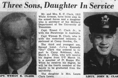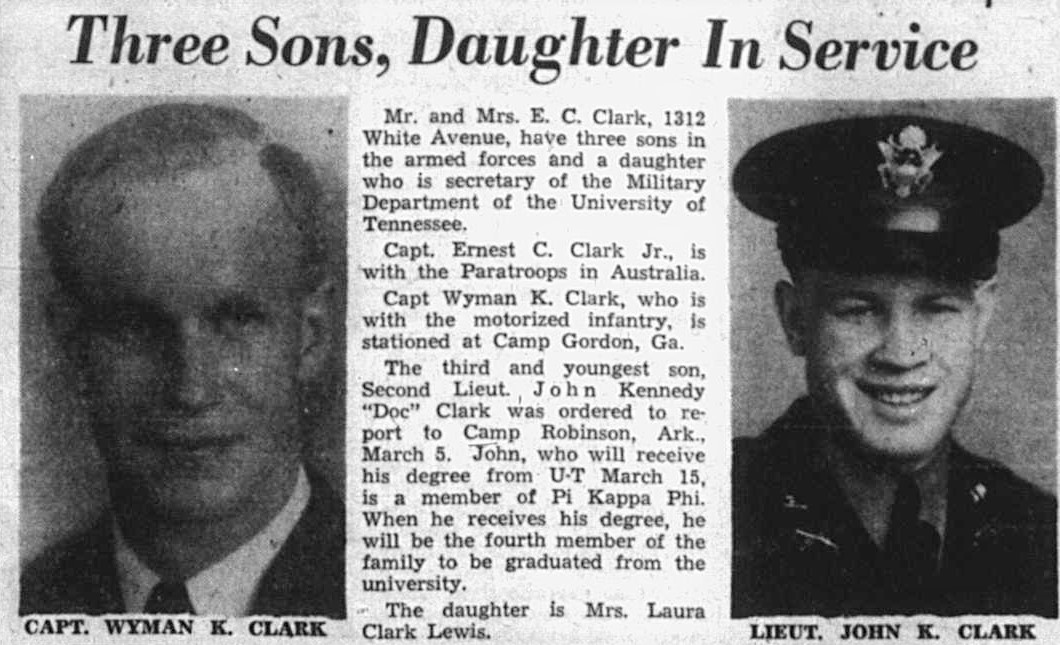 Mr. and Mrs. E.C. Clark, 1312 White Avenue, have three sons in the armed forces and a daughter who is secretary of the University of Tennessee. Capt. Ernest C. Clark Jr., is with The Paratroops in Australia. Capt. Wyman K. Clark, who is with the motorized infantry, is stationed at Camp Gordon, Ga. The third and youngest son, Second Lieut. John Kennedy “Doc” Clark was ordered to report to Camp Robinson, Ark., March 5. John who will receive his degree with U-T March 15, is a member of Pi Kappa Phi. When he received his degree, he will be the fourth member of the family to be graduated from the University. The daughter is Mrs. Laura Clark Lewis.