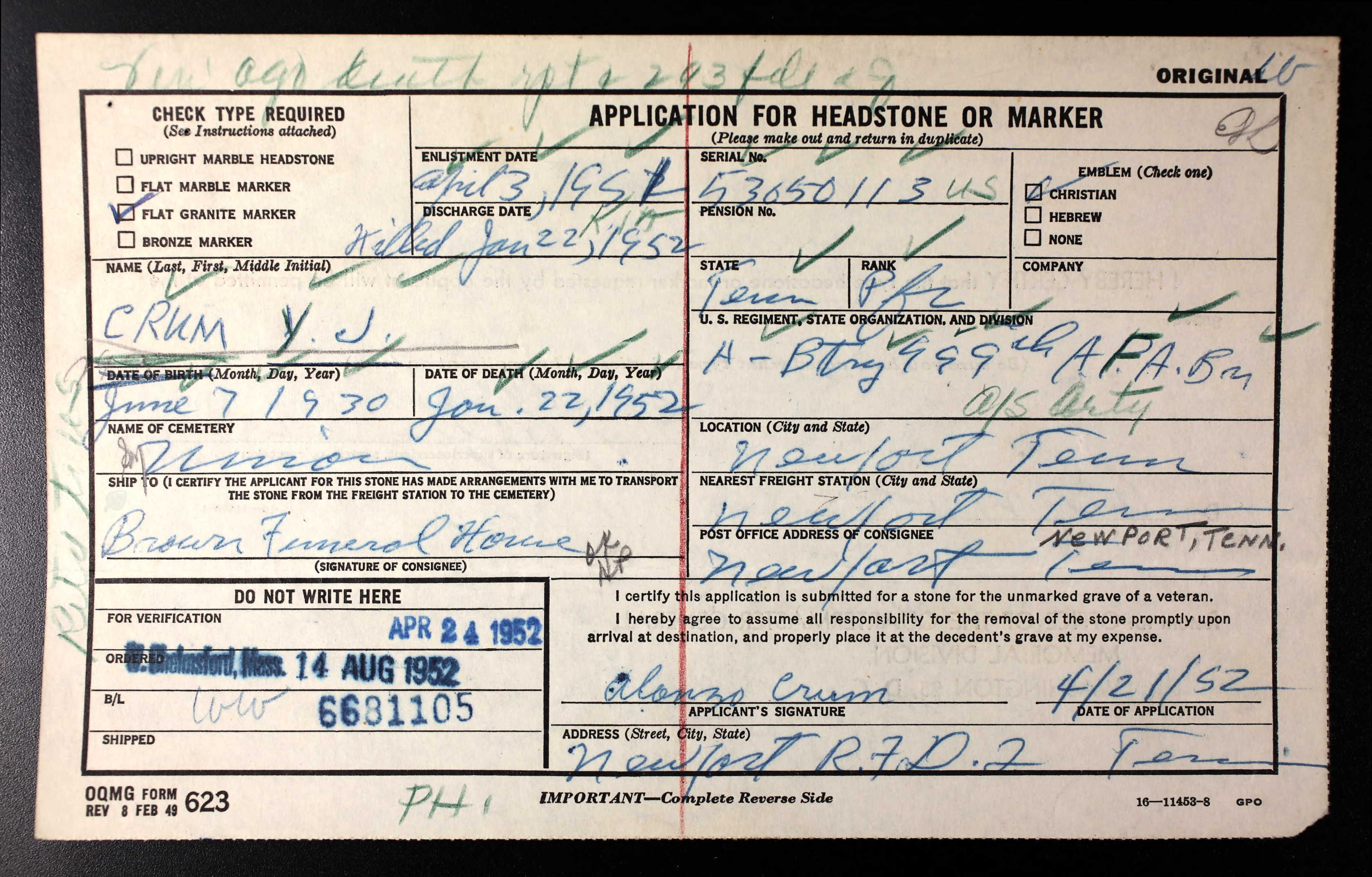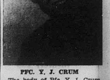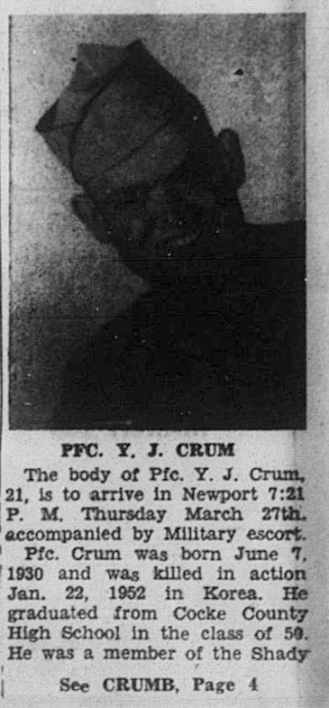 The body of Pfc. Y.J. Crum, 21, is to arrive in Newport March 27th, accompanied by Military escort. Pfc. Crum was born June 7, 1930 and was killed in action Jan 22, 1952 in Korea. He graduated from Cocke County High School in the class of 50. He was a member of the Shady Grove Baptist Church. He entered service April 3, 1951 and trained in Ft. Jackson, S.C. and Ft. Sill, Okla and went overseas December 22, 1951 and met his death one month later. Pfc. Crum was in Btry 999th. A.F.A: B.R.