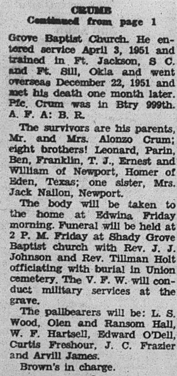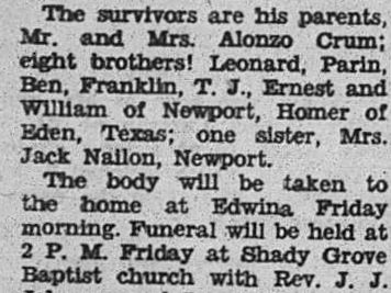 The survivors are his parents, Mr. and Mrs. Alonzo Crum; eight brothers, Leonard, Parin, Ben, Franklin, T.J. Ernest and William of Newport, Homer of Eden, Texas; one sister, Mrs. Jack Nailon, Newport.