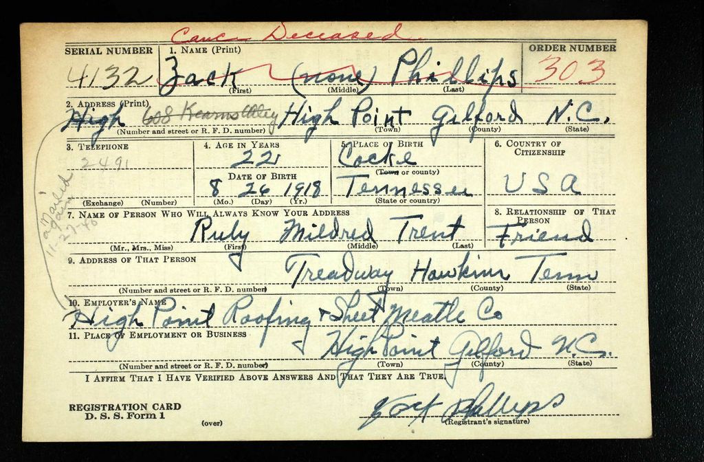 Zack Phillips was born on 26 August 1918 in Cocke, Tennessee, the son of James E. Phillips and Elizabeth “Betty” Styles. He married Norine Virginia Cox in Guilford, North Carolina in 1943