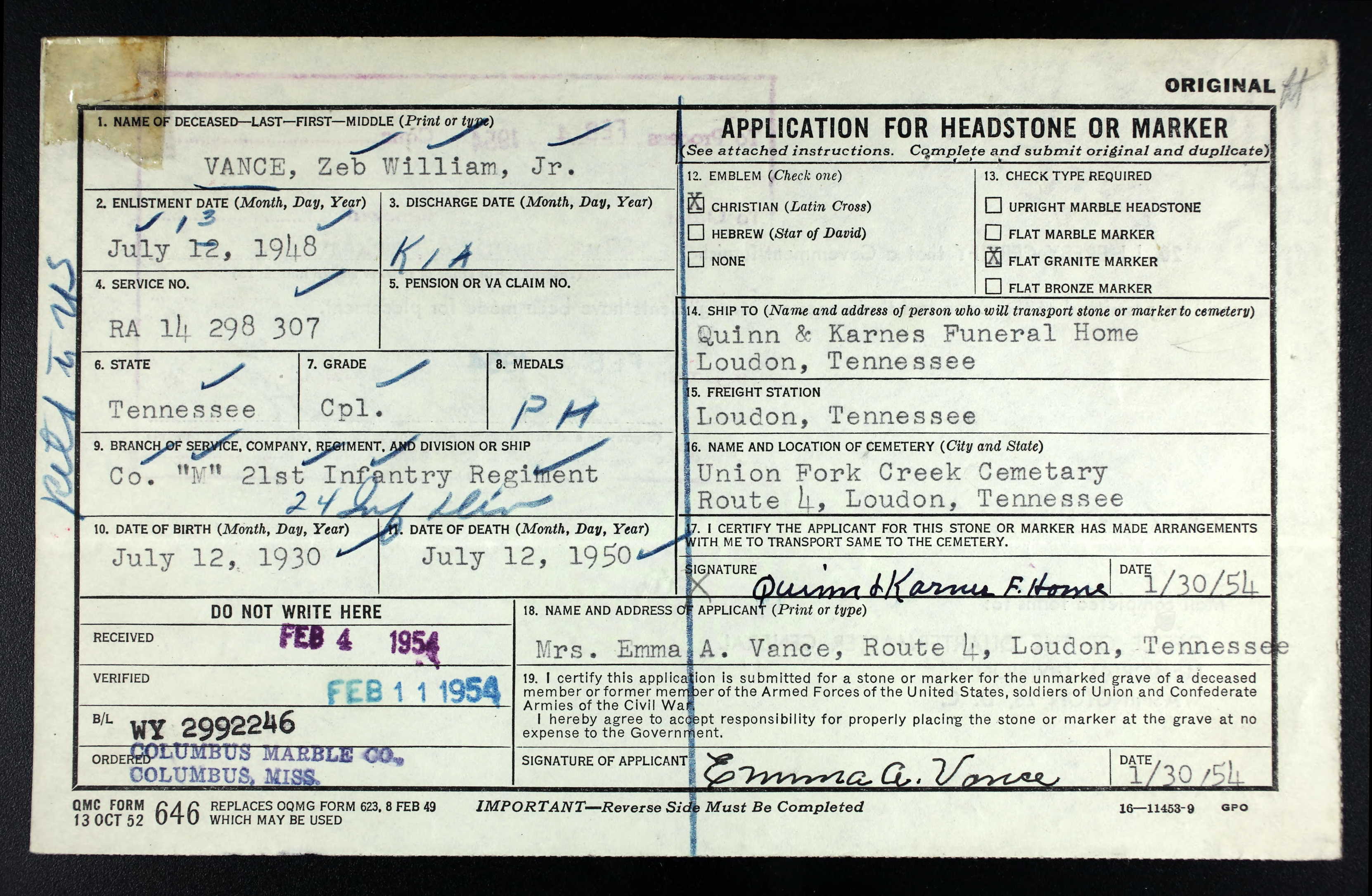 Zeb William Vance, Jr. was born July 20, 1930, the son of Zeb William Vance Sr. and Emma Ann Vance of Loudon County, TN. Private First Class Vance was a Heavy Weapons Infantryman with Company M, 21st Infantry Regiment, 24th Infantry Division, United States Army. On June 30, 1950, Corporal Vance and his regiment were ordered from Itazuke Air Base in Japan to Taejon, South Korea, forming the first infantry element in Korea that would be called Task Force Smith. Vance’s battalion arrived in Pusan on July 4, 1950, and proceeded to Chochiwon over the next week. On July 12, 1950, only twelve days after being deployed to South Korea, Vance and the rest of the members of 3rd Battalion were engaged with North Korean tanks and infantry. The North Korean troops soon had the battalion surrounded, and the 3rd Battalion was completely overrun. Corporal Zeb Vance was one of over three hundred killed during that engagement at Chochiwon. Zeb Vance is buried at Union Fork Creek Cemetery in Loudon, TN.