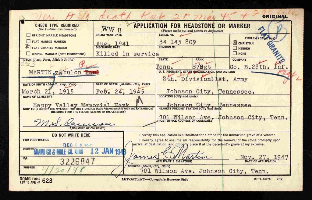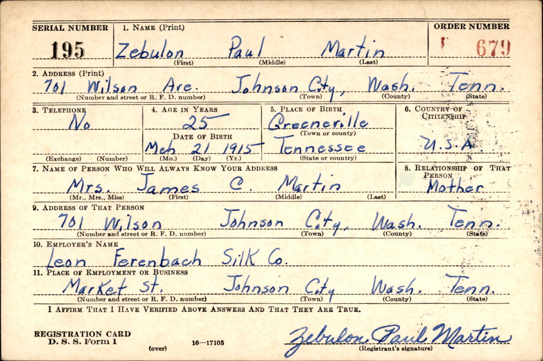 Zebulon Paul Martin was born 21 March 1915. He was the son of James Clark Martin and Lela Belle Wilkerson. He was married to Blanche Pauline McKinney and father of Norma Jean Martin. He died 24 February 1945 in Duren, Germany
