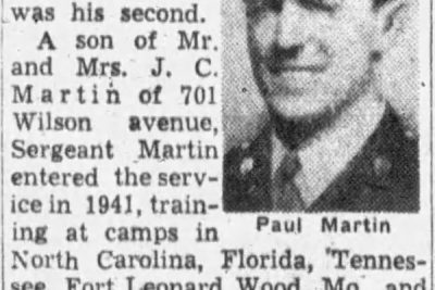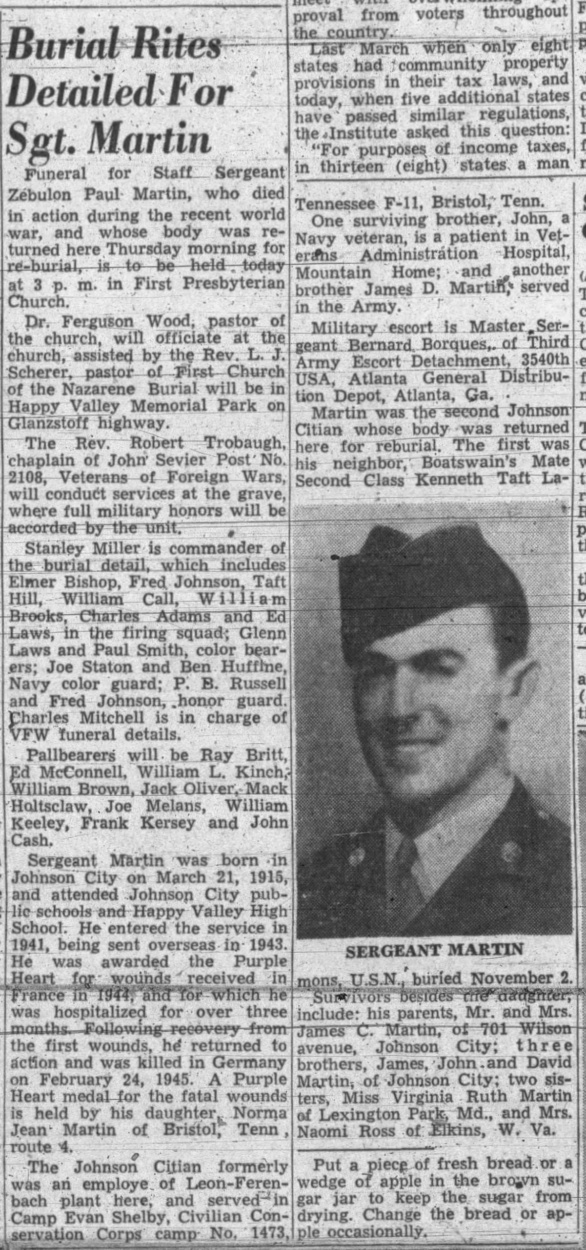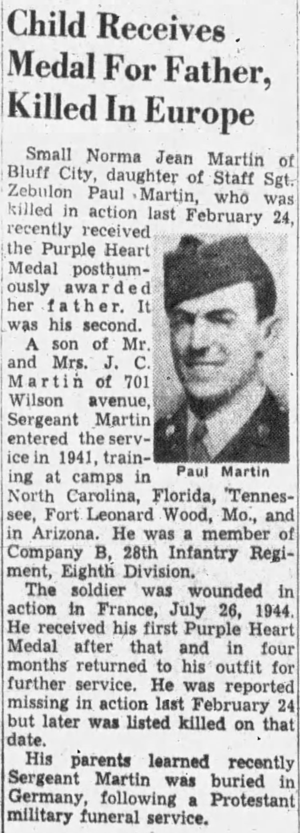 Small Norma Jean Martin of Bluff City, daughter of Staff Sgt. Zebulon Paul Martin, who was killed in action last February 24, recently received the Purple Heart Medal Posthumously awarded her father. It was his second. A son of Mr. and Mrs. J.C. Martin of 701 Wilson avenue, Sergeant Martin entered the service in 1941, training at Camps in North Carolina, Florida, Tennessee, Fort Leonard Wood, Mo., and in Arizona. He was a member of Company B, 28th Infantry Regiment, Eighth Division. The soldier was wounded in action in France, July 26, 1944. He received his first Purple Heart Medal after that and in four months returned to his outfit for further service. He was reported missing in action last February 24 but later was listed killed on that date. His parents learned recently Sergeant Martin was buried in Germany, following a Protestant military funeral service.