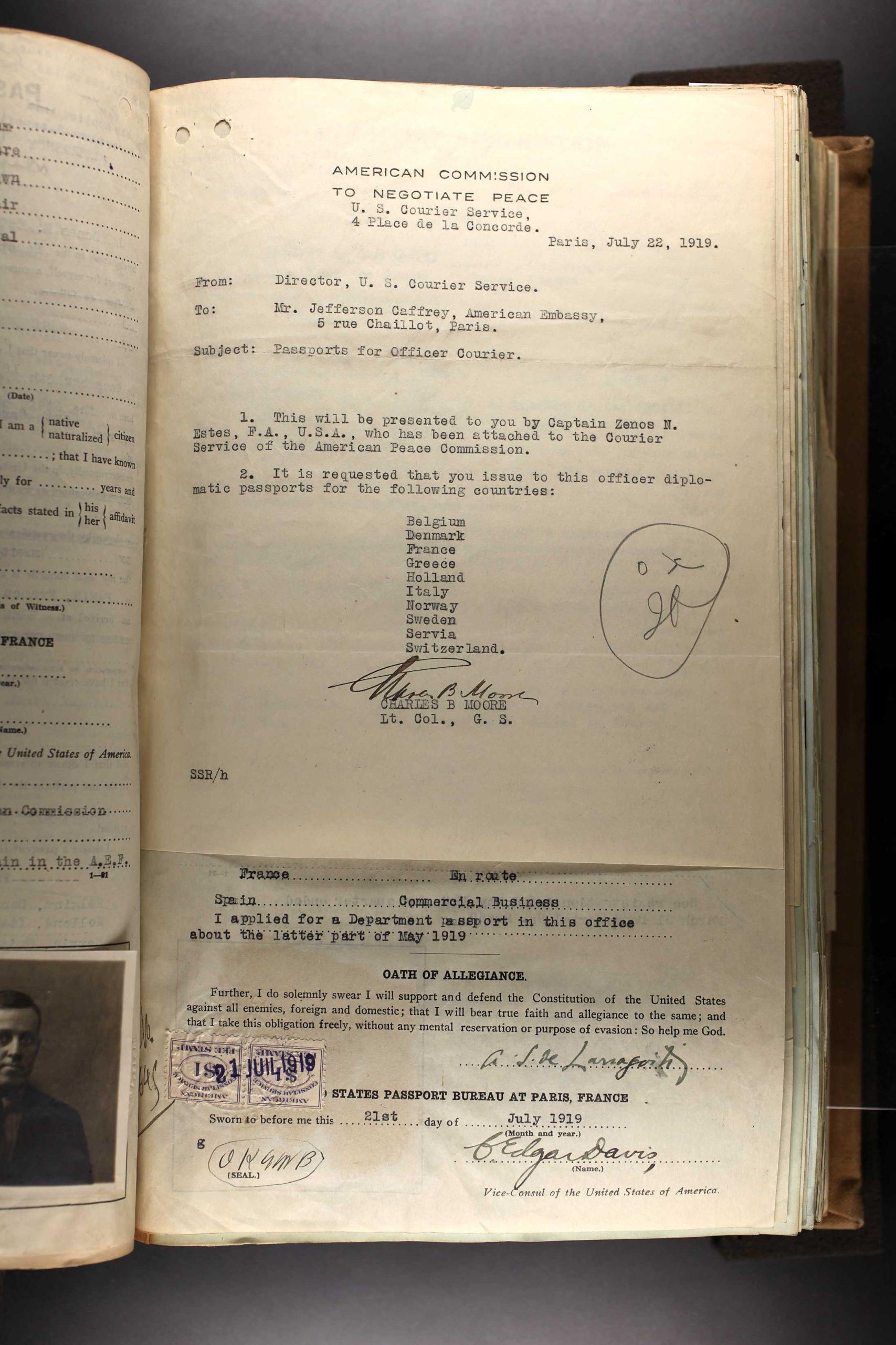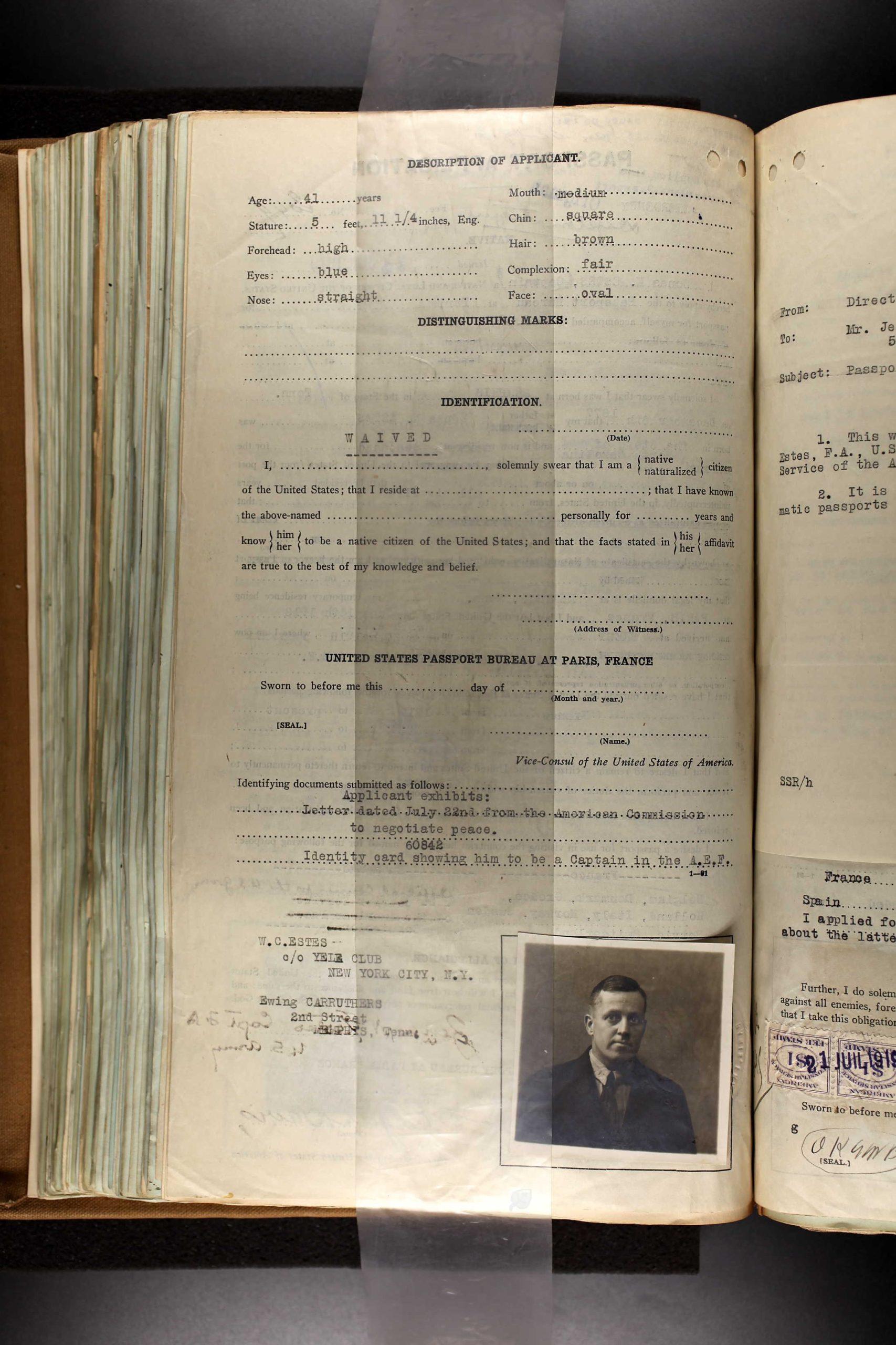 Captain Estes was stationed at Camp Gordon, Georgia, Camp Pike, Arkansas and Hobroken, New Jersey. He served overseas during WWI from 15 July 1918 to 26 September 1919 in France.